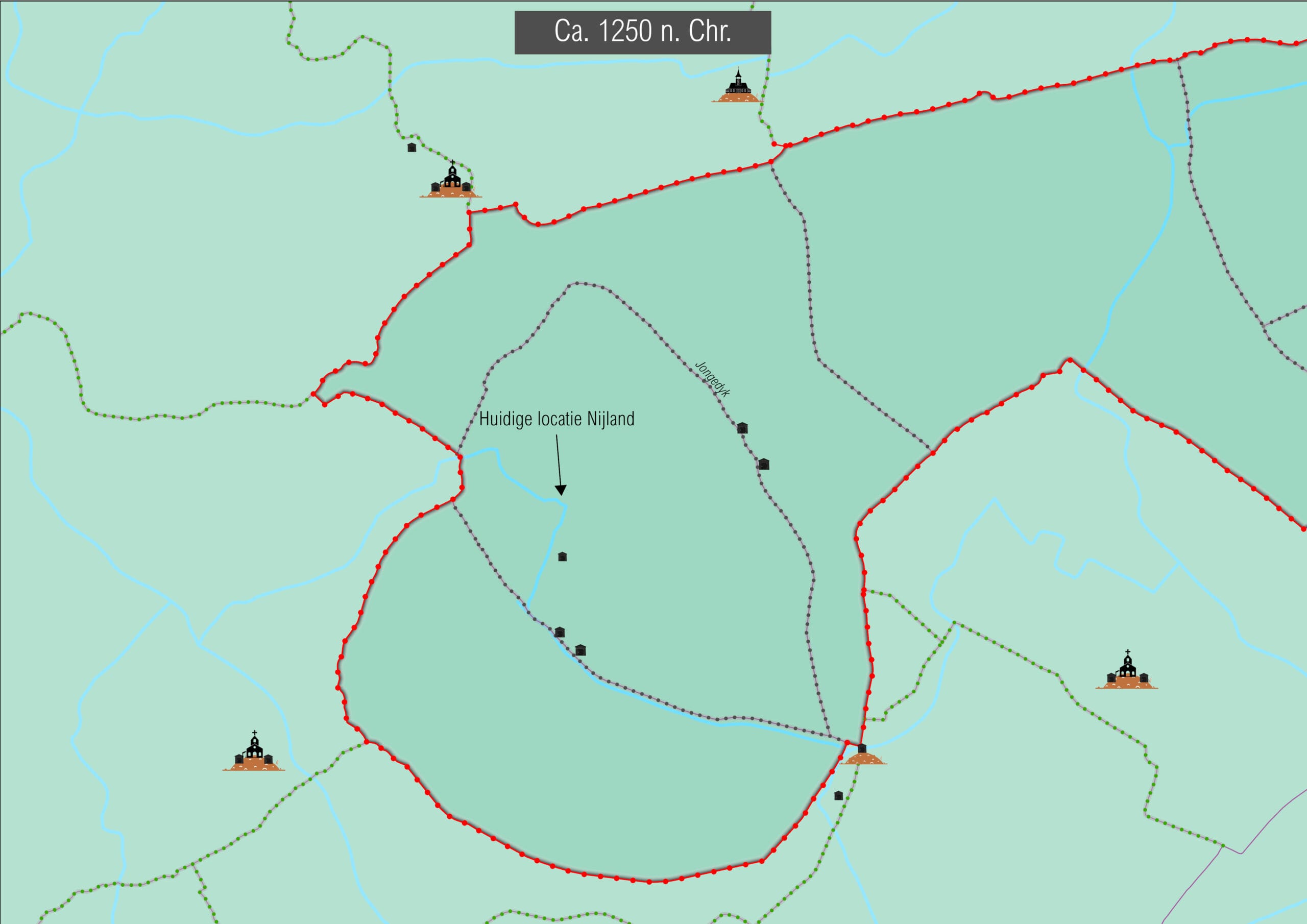 Het ingepolderde zuidelijke gedeelte van de Middelzee was in de 12e en 13e eeuw in principe bewoonbaar. Op dit ‘nieuwland’ moeten toen her en der al woonhuizen hebben gestaan. Het gebied werd in de vroege 13e eeuw als Nova Terra (Nieuw Land) aangeduid. Of er toen al sprake was van een zekere woonkern is niet met zekerheid te zeggen. Dat veranderde echter met stichting van de Nicolaaskerk in de tweede helft van de 13e of de vroege 14e eeuw. Deze stichtingslocatie was namelijk de plek waar het dorp Nijland zijn oorsprong vond. In tegenstelling tot de omringende dorpen die net buiten de voormalige Middelzeeboezem lagen werd Nijland niet op een terp gesticht.